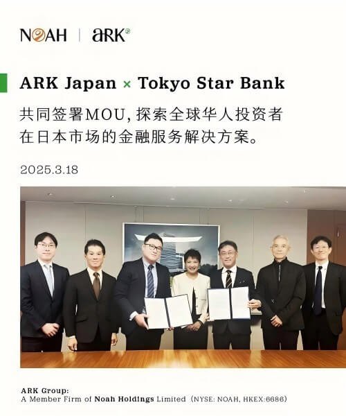 Ms. Jingbo Wang, the Chairwoman of Noah Holdings, remarked, “Tokyo Star Bank provides international investors in Japan with financial services that seamlessly integrate a global perspective with local insights. This aligns perfectly with ARK Japan’s mission to deliver personalized solutions to local Chinese clients. By continuously cultivating partnerships with premier institutions in the Japanese market, we aspire to create more comprehensive and integrated financial service experiences for the Chinese-speaking community.”